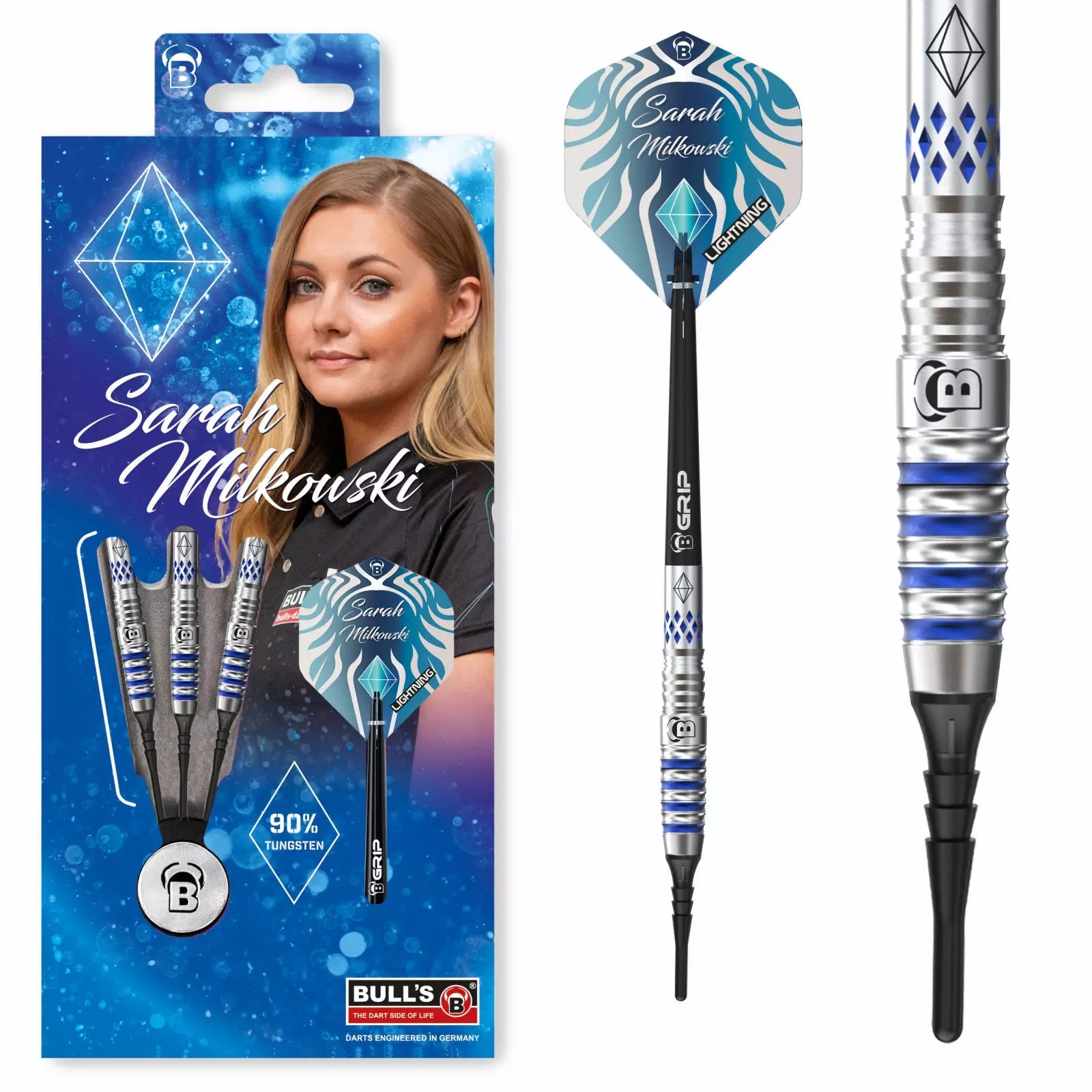 Der Spielerdart besteht zu 90% aus Tungsten. Den auffälligen Flight ziert ein Diamantenabbild, das Markenzeichen von Sarah "Sapphire" Milkowski. Gleiches gilt für den Barrel ihres Darts. Der Barrel besitzt unterschiedliche Gripzonen, und ist mit unterschiedlichen blauen Akzenten designed. Der Tefo-X Shark Soft-Tip ergänzt diesen Dart optimal. Eine der innovativsten und beliebtesten Spitzen im Dartsport. Formstabilität, geringe Vibration und hohe Belastbarkeit zeichnen diese Spitze aus. Sarah ist eine erfolgreiche Dart-Influencerin und seit 2020 Teil des BULL'S Teams. Spielerisch sammelte sie erste Erfahrungen beim NWDV (Nordrhein-Westfälischer Dartverband) und bei DDV-Ranglistenturnieren. Sapphire war eine von zwei deutschen Starterinnen bei der ersten Ausgabe der PDC Women's Series und schaffte es zweimal in die Runde der letzten 32.