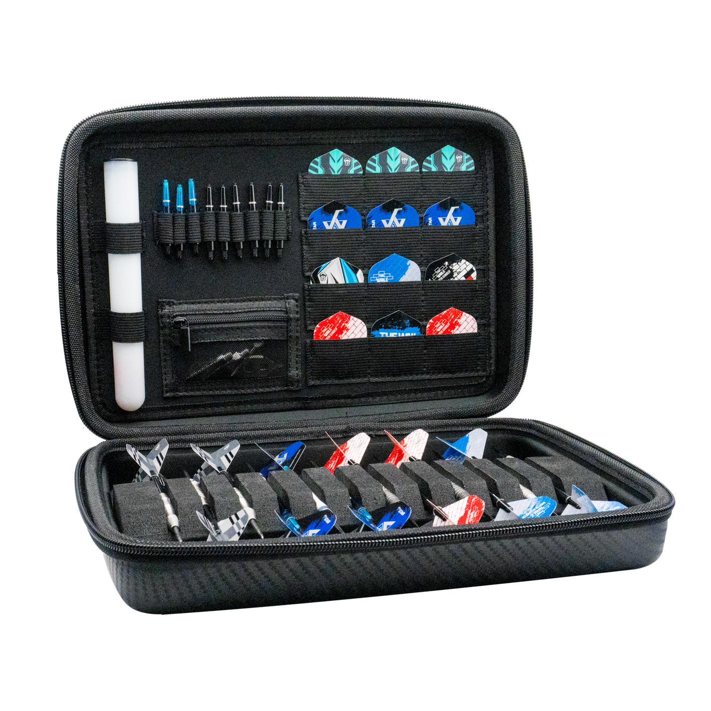 Das Orbis Case 3XL in Carbon-Optik bietet Ihnen die bewährte Qualität unserer Orbis Cases jetzt in einer noch größeren Version, die speziell für anspruchsvolle Dartspieler entwickelt wurde. Mit seinem großzügigen Platzangebot können Sie problemlos bis zu 12 Darts (4 Sets) sicher verstauen, inklusive 12 Set Flights und 3 Sets Schäfte. Eine praktische Halterung für ein Softtip-Röhrchen sorgt dafür, dass Ihre Spitzen sicher und griffbereit aufbewahrt werden. Zusätzlich gibt es eine kleine Reißverschlusstasche, die ausreichend Platz für weiteres Zubehör bietet, wie z. B. Ersatzteile oder kleine Werkzeuge.Das Case ist so konzipiert, dass Ihre Darts und Flights stets gut geschützt sind und nicht verknicken oder beschädigt werden. Das durchdachte Design sorgt dafür, dass Ihre Ausrüstung während des Transports stets sicher und ordentlich verstaut ist. Der Tragegriff an der Oberseite ermöglicht einen bequemen Transport, sodass Sie Ihr Case immer sicher und komfortabel bei sich haben können. Die edle Carbon-Optik verleiht dem Orbis Case 3XL nicht nur eine moderne und stylische Optik, sondern macht es auch zu einem praktischen und zuverlässigen Begleiter für jedes Dart-Abenteuer.