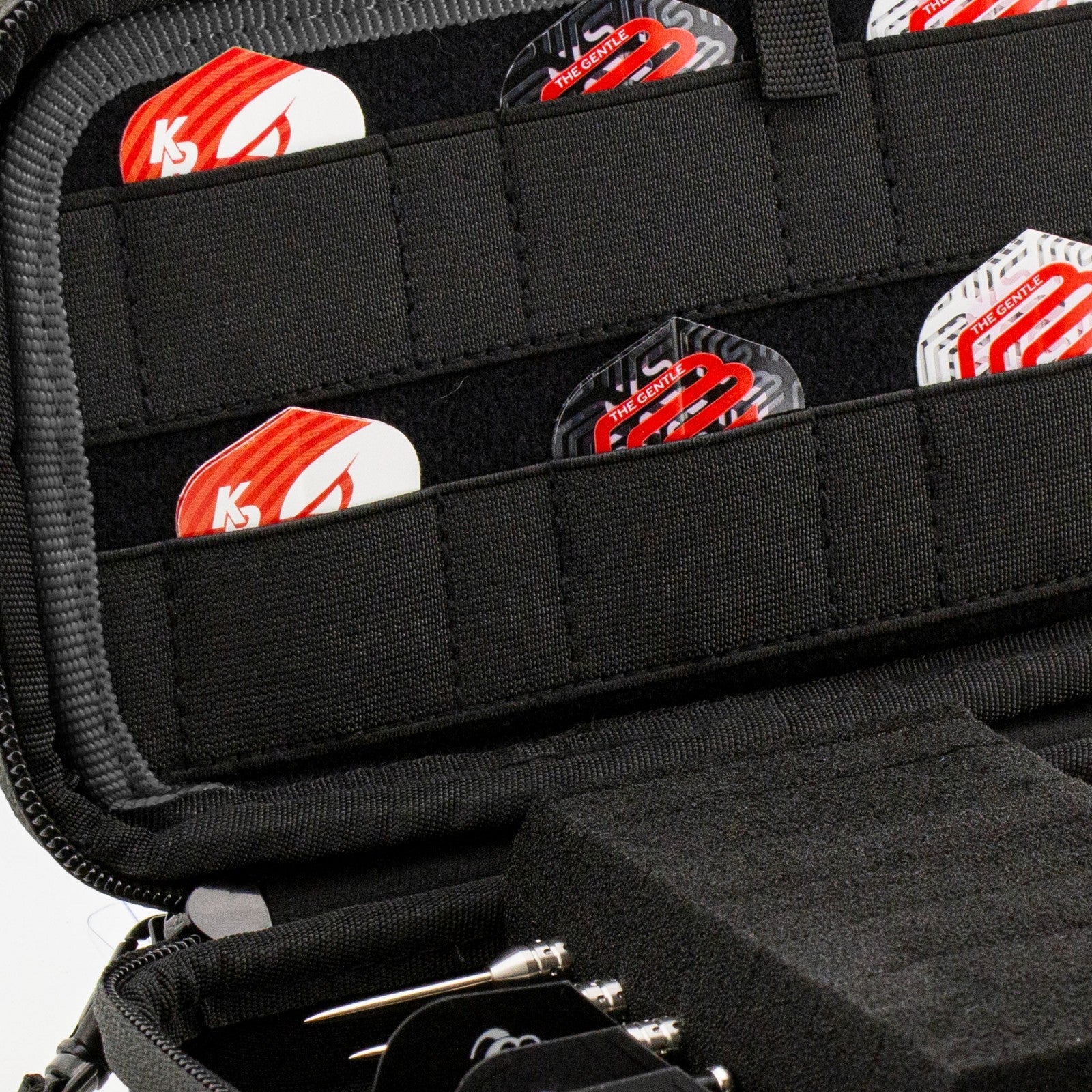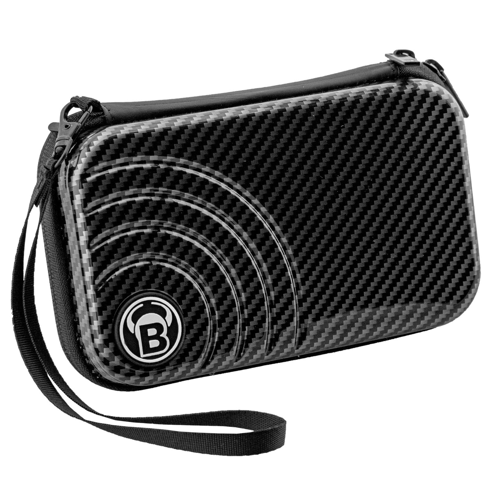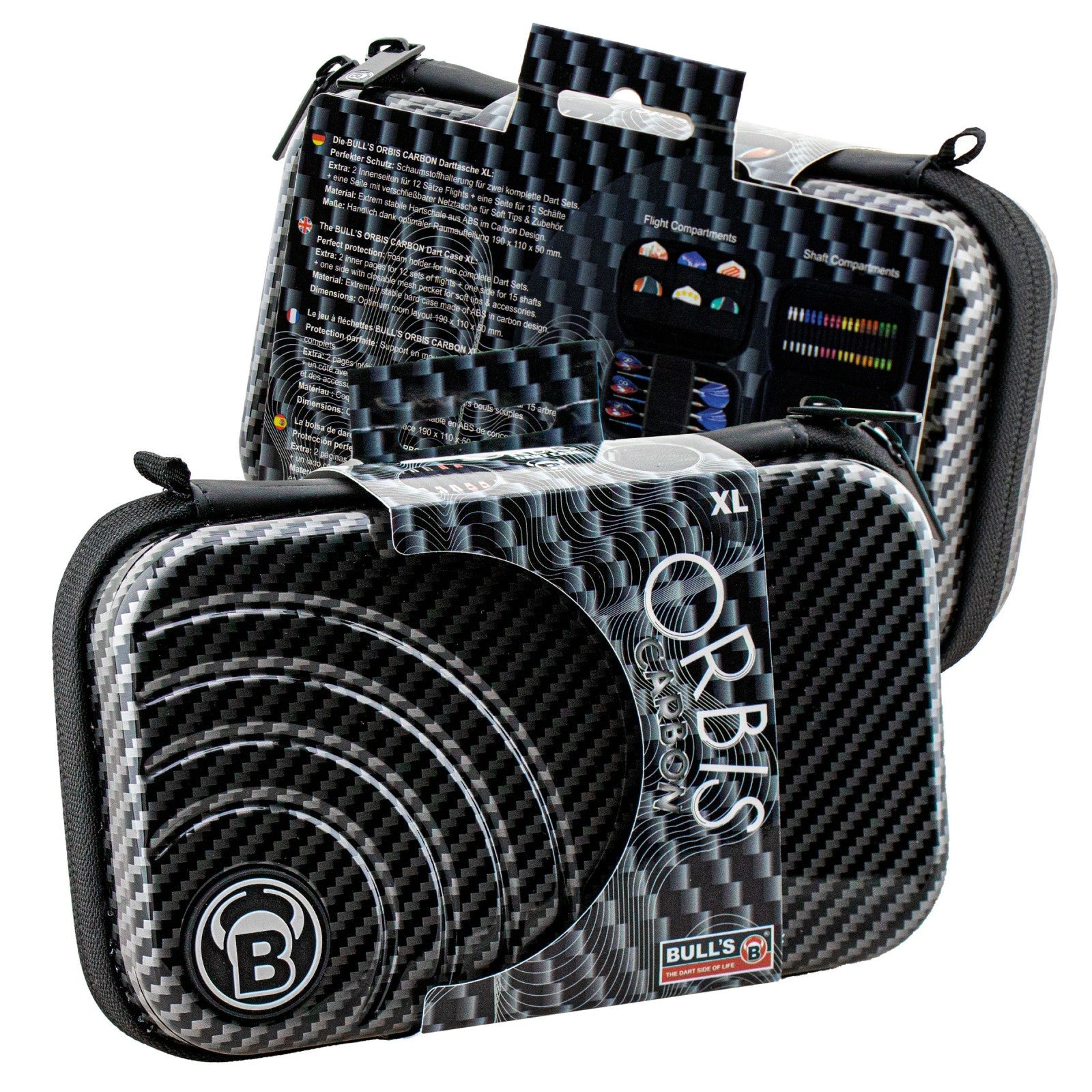 Orbis HS Carbongrey XL Das BULL'S Orbis im neuen Carbon-Design. Die extrem stabile Darttasche aus ABS ist in S und XL verfügbar. Die Größe XL misst 190 x 110 x 50 mm und beinhaltet eine Schaumstoffhalterung für zwei komplette Dart-Sets, sowie zwei Innenseiten für 12 Sätze Flights. Eine Seite besitzt Halterungen für 15 Schäfte und auf der anderen Seite befindet sich eine verschließbare Netztasche für Soft-Tips & Zubehör.