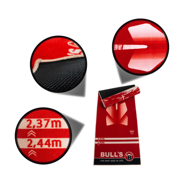 Der BULL'S Carpet-Mat "180" red ist die perfekte Ergänzung zu Ihrem Dartboard. Egal ob im Wohnzimmer, in der Garage oder wo auch immer Sie Ihre Dartscheibe anbringen. Die neuen Designs der BULL'S Dartteppiche verleihen Ihrem Spiel eine professionelle Atmosphäre, die sie begeistern wird. Der hochwertige BULL'S Carpet-Mat "180" besteht aus 100% Nylon und einer rutschfesten TPR Rückseite. Aufgrund der hohen Qualität ist dieser Teppich sehr langlebig und bietet einen optimalen Schutz für herunterfallende Darts sowie für den Fußboden. Einfach ausrollen und los geht es! Nicht nur optisch ein Highlight, auch für die Umwelt. Die BULL'S Dartteppiche sind alle als besonders umweltfreundlich ausgezeichnet worden.