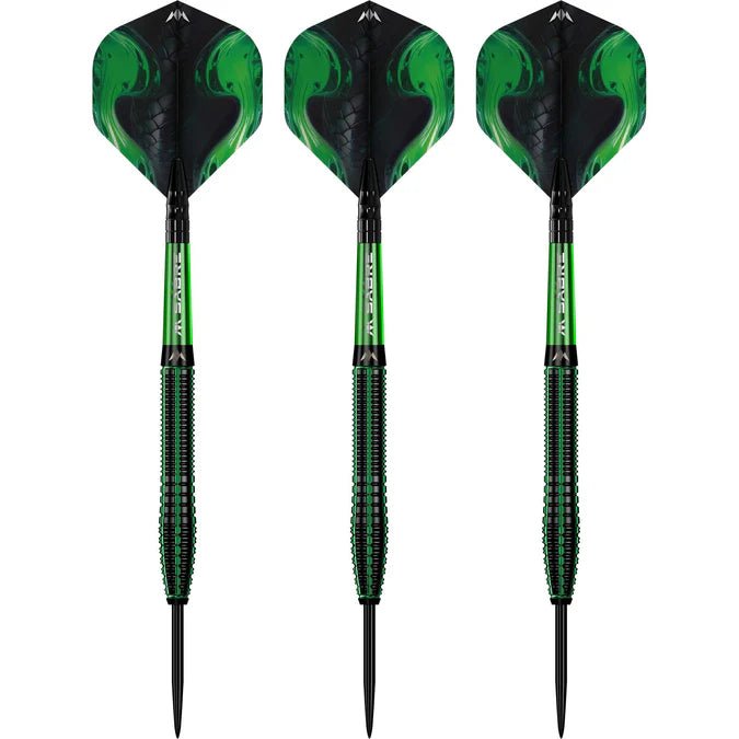 Erobern Sie die Welt des Dartsports mit den Mission Venom Darts. Hergestellt aus 90% Wolfram und mit einer atemberaubenden schwarzen PVD- und grünen Elektroplattierung versehen, wird der Venom Dart jedem Gegner das Fürchten lehren. Der Barrel verfügt über radiale Rillen und horizontale Fräsungen für einen verbesserten Grip. Ein gerader hinterer Teil geht in einen vorderen Teil mit einer sich verjüngenden, glatten Front über, die sich zu einer schwarzen Spitze verjüngt. Der hintere Teil des Barrels verjüngt sich auf natürliche Weise zu einem glatten Abschnitt mit einem lasergravierten Mission-Logo.