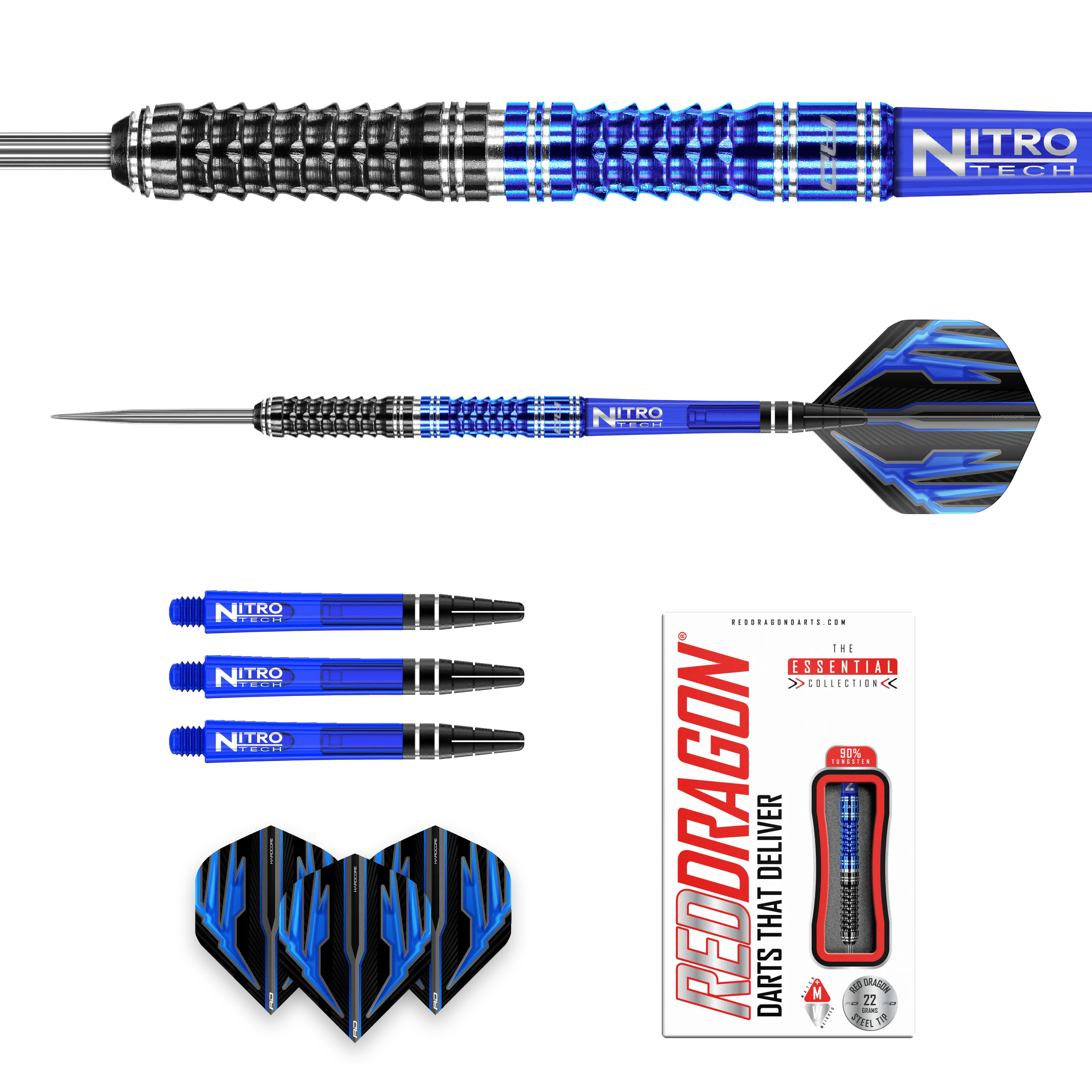 Das Set ist ausgestattet mit blauen Red Dragon Nitrotech Shafts und Red Dragon Flights.