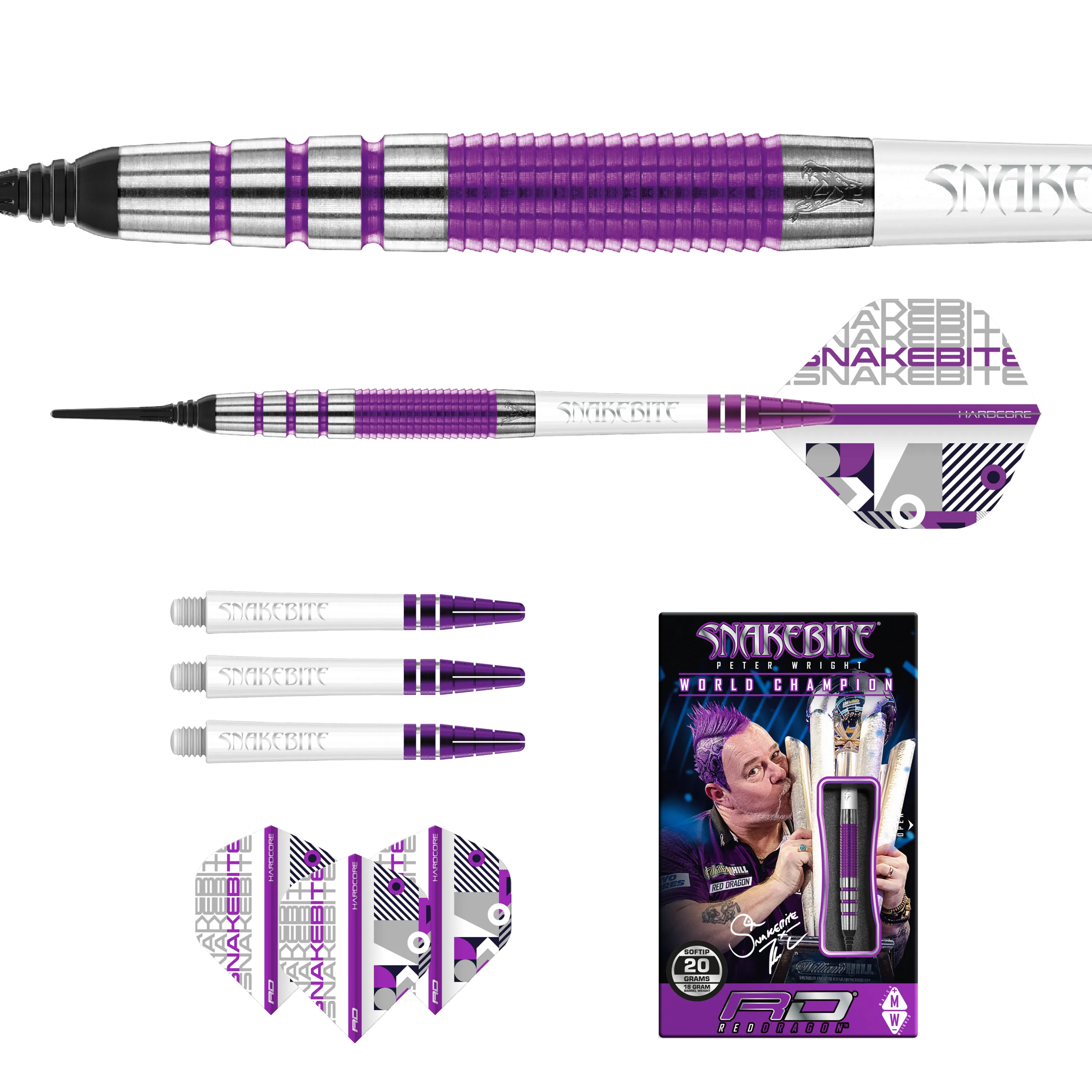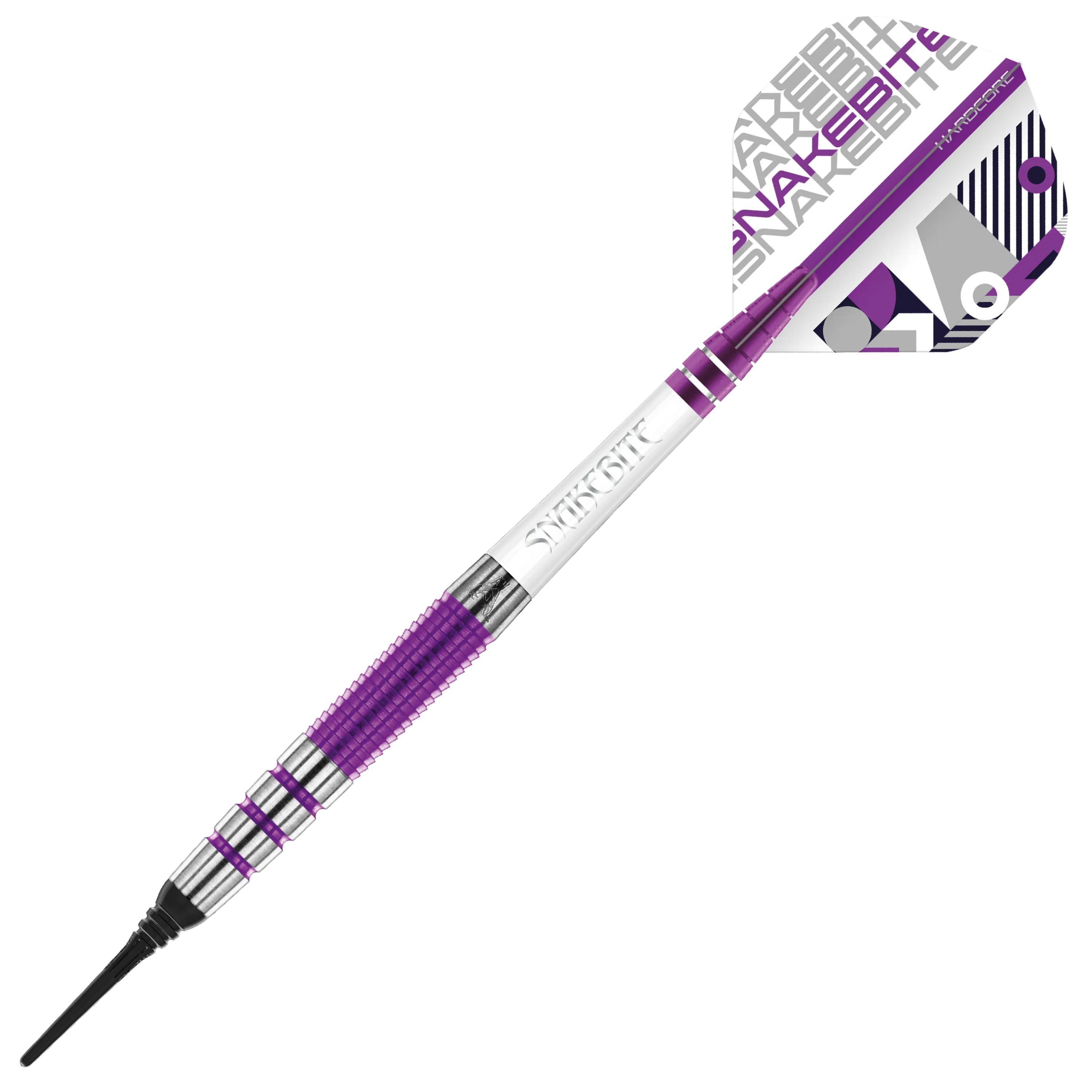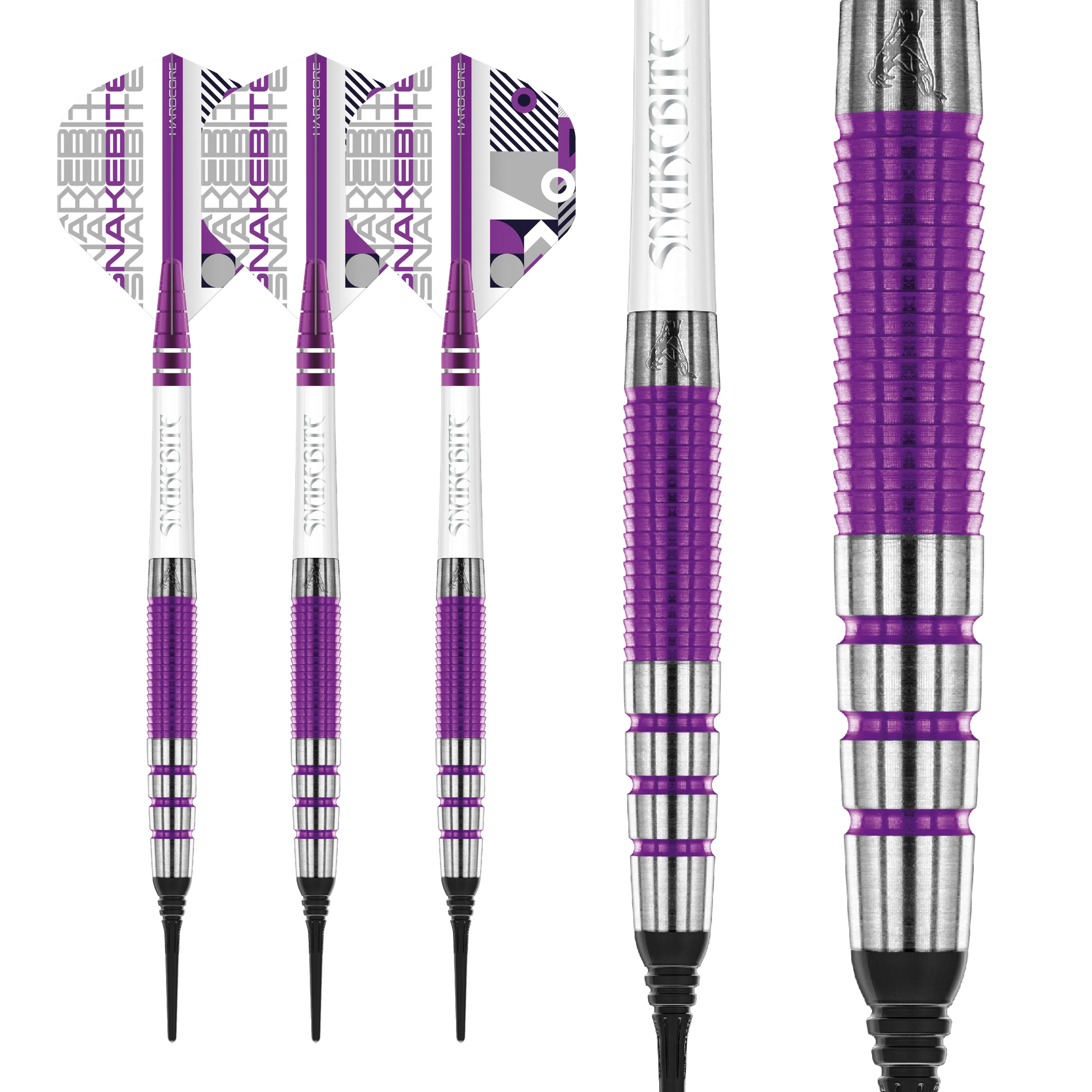 Das Set ist ausgestattet mit weiß-lila Snakebite Nitrotech Shafts und Snakebite Hardcore Flights.