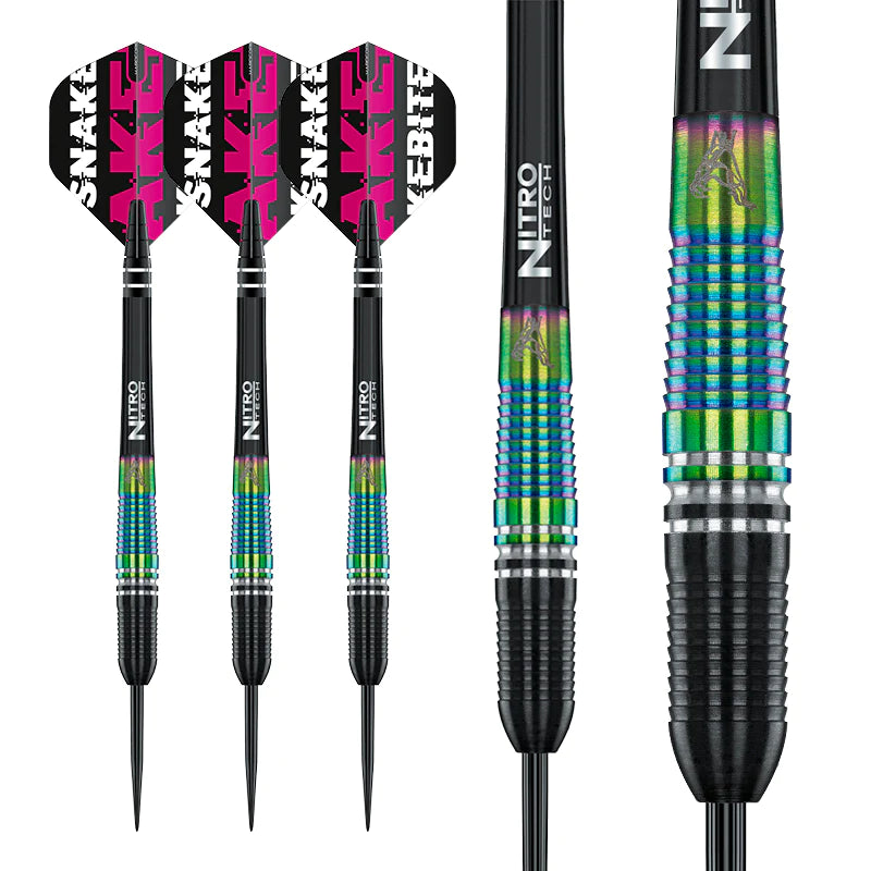 Das Set ist ausgestattet mit schwarzen Red Dragon Nitrotech Shafts und Red Dragon Snakebite Flights.