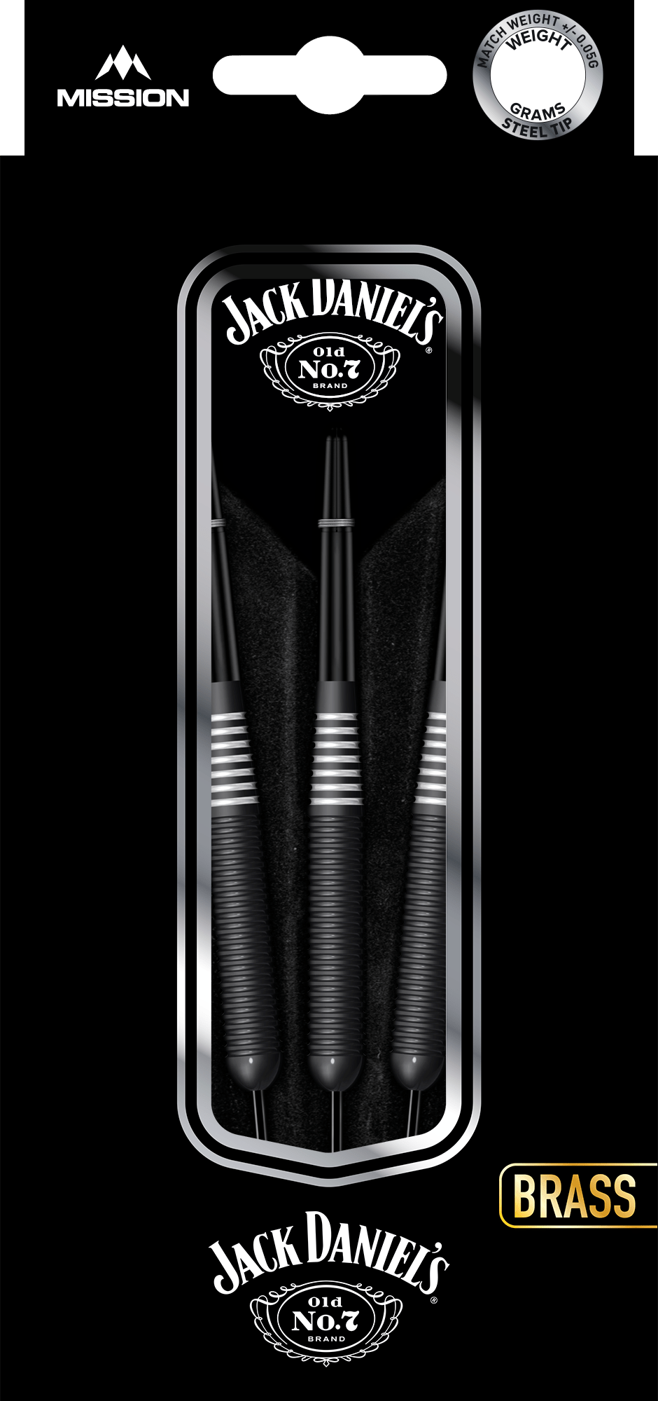 Die Jack Daniels Brass Darts haben eine runde Anfangsform die in ein gerades Barreldesign mit feinen Ringnuten übergeht. Auf der Rückseite des Barrel befindet sich ein sehr fein verjüngter hinterer Abschnitt mit 7 weiß lackierten Rillen. Der Barrel ist vollständig mit schwarzer Galvanik beschichtet.