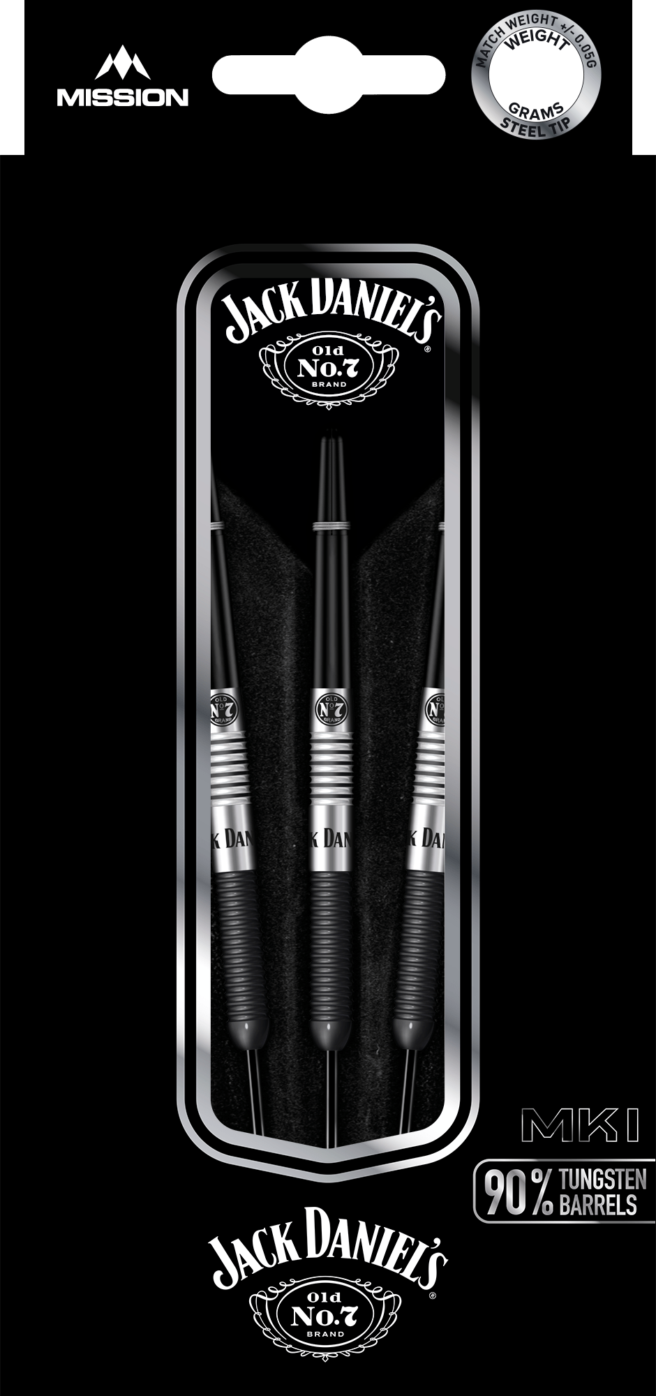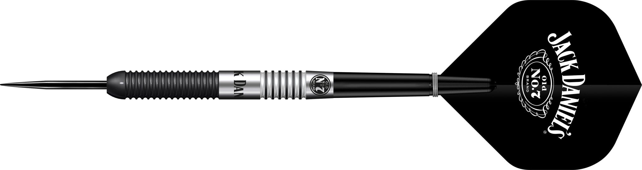 Der Jack Daniels 90% Tungsten verfügt über ein gerades Barreldesign, bei dem der Übergang von der Dartspitze mit kleinem Radius in einen Ringabschnitt mündet, der Mittelteil ist mit dem lasergeätzten Jack Daniels-Logo versehen und der hintere Teil trägt das Old No7 Logo. Während der Herstellung wird die schwarze PVD-Beschichtung zweimal bearbeitet, wodurch ein scharfer Kontrast zu dem Wolfram entsteht, dass durch präzise Nachbearbeitungsverfahren freigelegt wird.