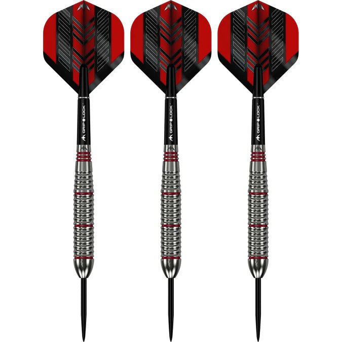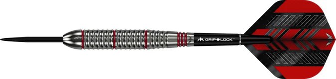 Setzen Sie neue Maßstäbe am Oche mit den Mission Rogue Darts. Diese Messingdarts haben eine silberne Beschichtung mit einem Ringgriff entlang des Barrels, der von drei rot lackierten Ringen durchsetzt ist. Der hintere Teil des Barrels ist mit rot lackierten Ringen und einem gelaserten Mission-Logo versehen. Eine glatte Front an der Vorderseite des Barrels führt zu einer schwarzen Spitze.