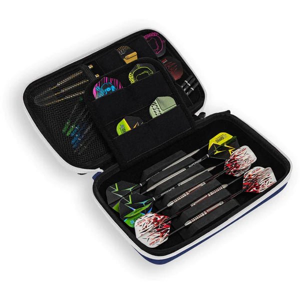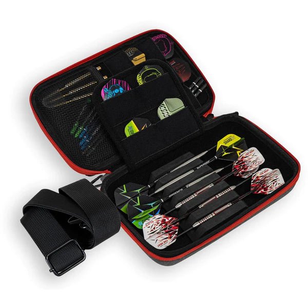 Diese einzigartig praktische und ergonomisch kompakte Tasche wurde so konzipiert, dass sie 6 vollständig montierte Darts aufnehmen kann und viel zusätzlichen Stauraum bietet.