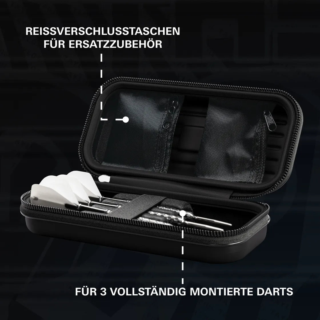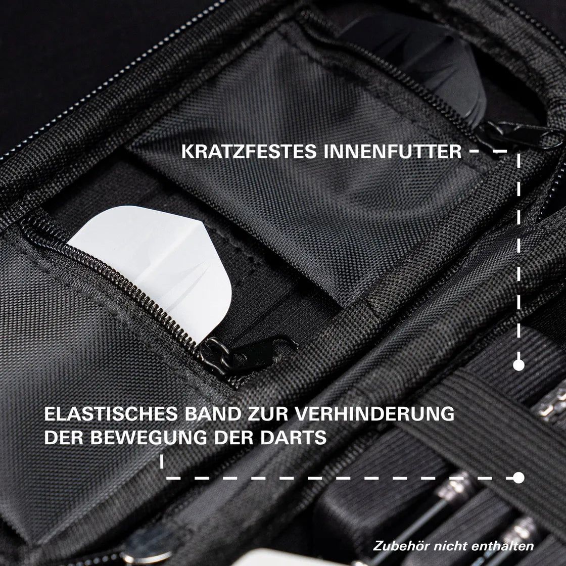 Das robuste Hartschalen-Case schützt deine Profi-Darts zuverlässig vor Stößen und Druck. Im Inneren bietet das Takoma Dartwallet Platz für drei vollständig montierte Turnierdarts. Separate Reißverschlussfächer sorgen für Ordnung und Stauraum für Ersatzflights, Shafts, Swiss Points oder dein Swiss-Point-Tool – ideal für Training, Liga und Turniere.