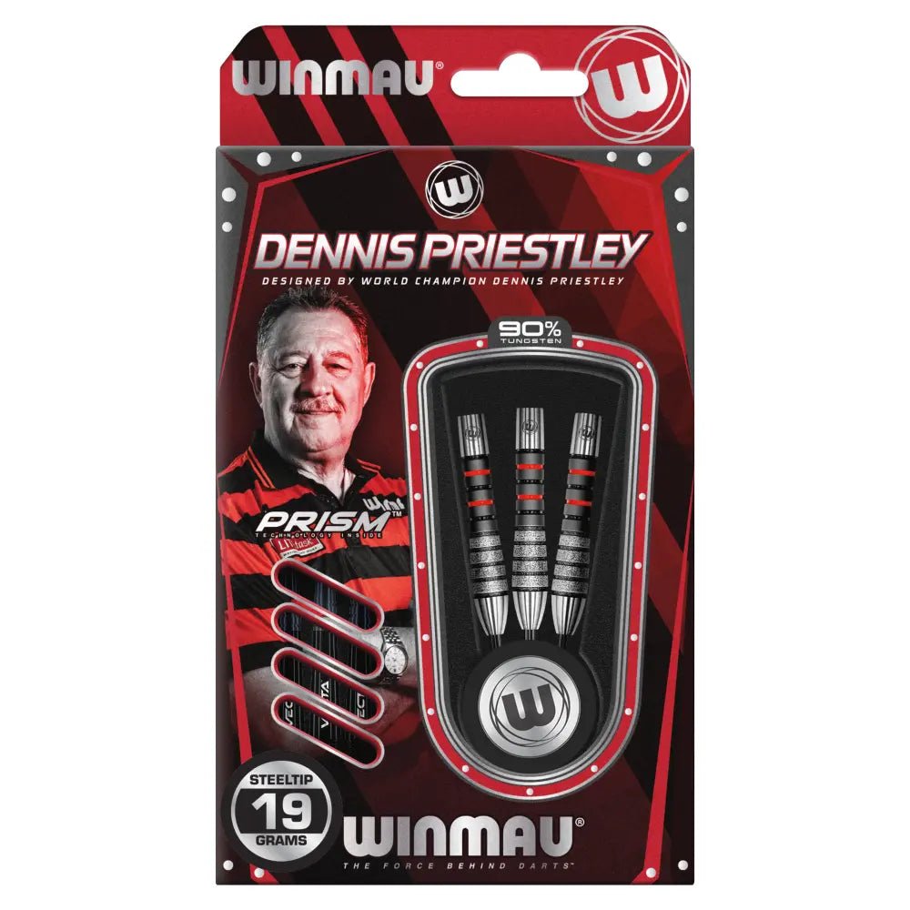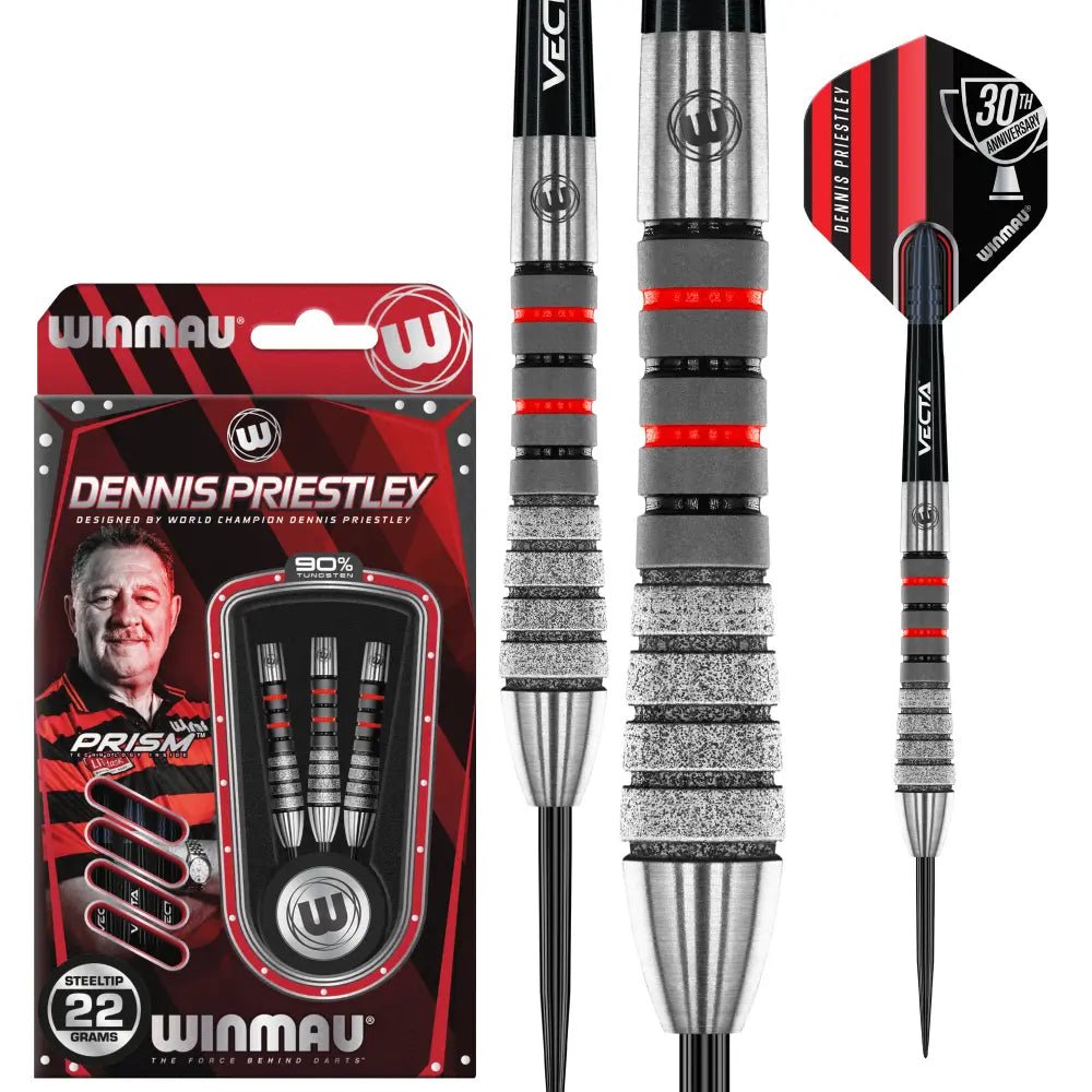 Das Set ist ausgestattet mit schwarzen Winmau Vecta Shafts (Short) und Winmau Dennis Priestley Prism Flights.
