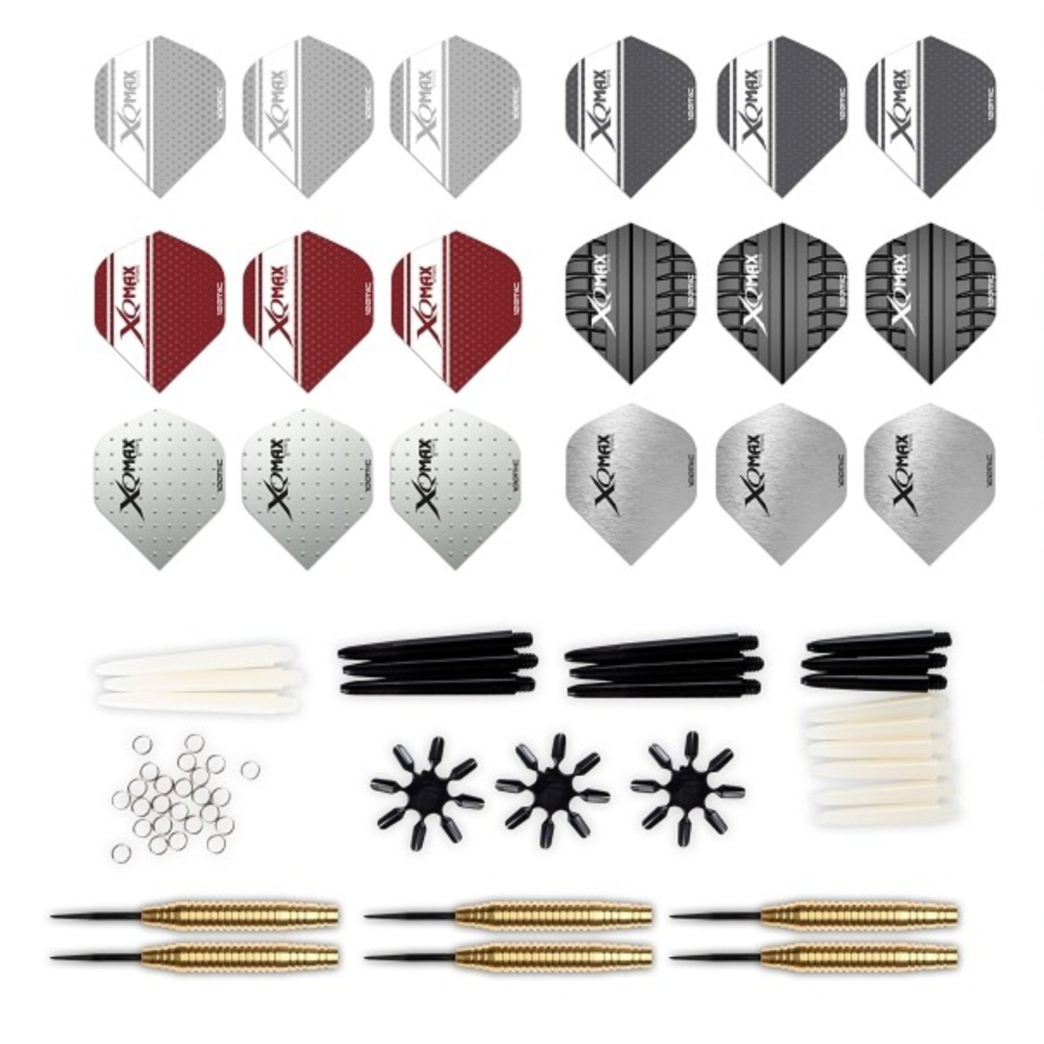 XQ-Max Dart Accessory Kit. 90 Teile. Beinhaltet 2 Sätze Softdart Barrels 18g, 6 Satz Nylon Schäfte, 6 Satz Flights, 100 Micron XQ-Max Design, 16 Flight Protektoren, 32 O-Ringe. Check Out Tabelle auf der Verpackungsrückseite.