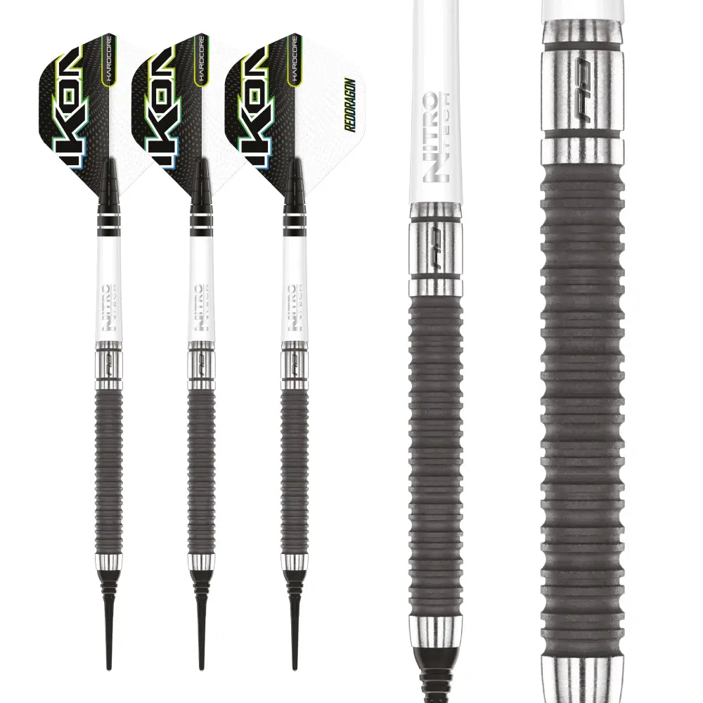 The set is equipped with white Nitrotech polycarbonate shafts (short) and Ikon Hardcore extra thick standard flights.