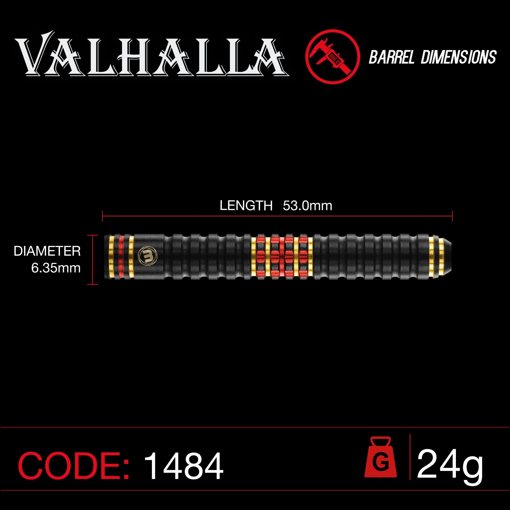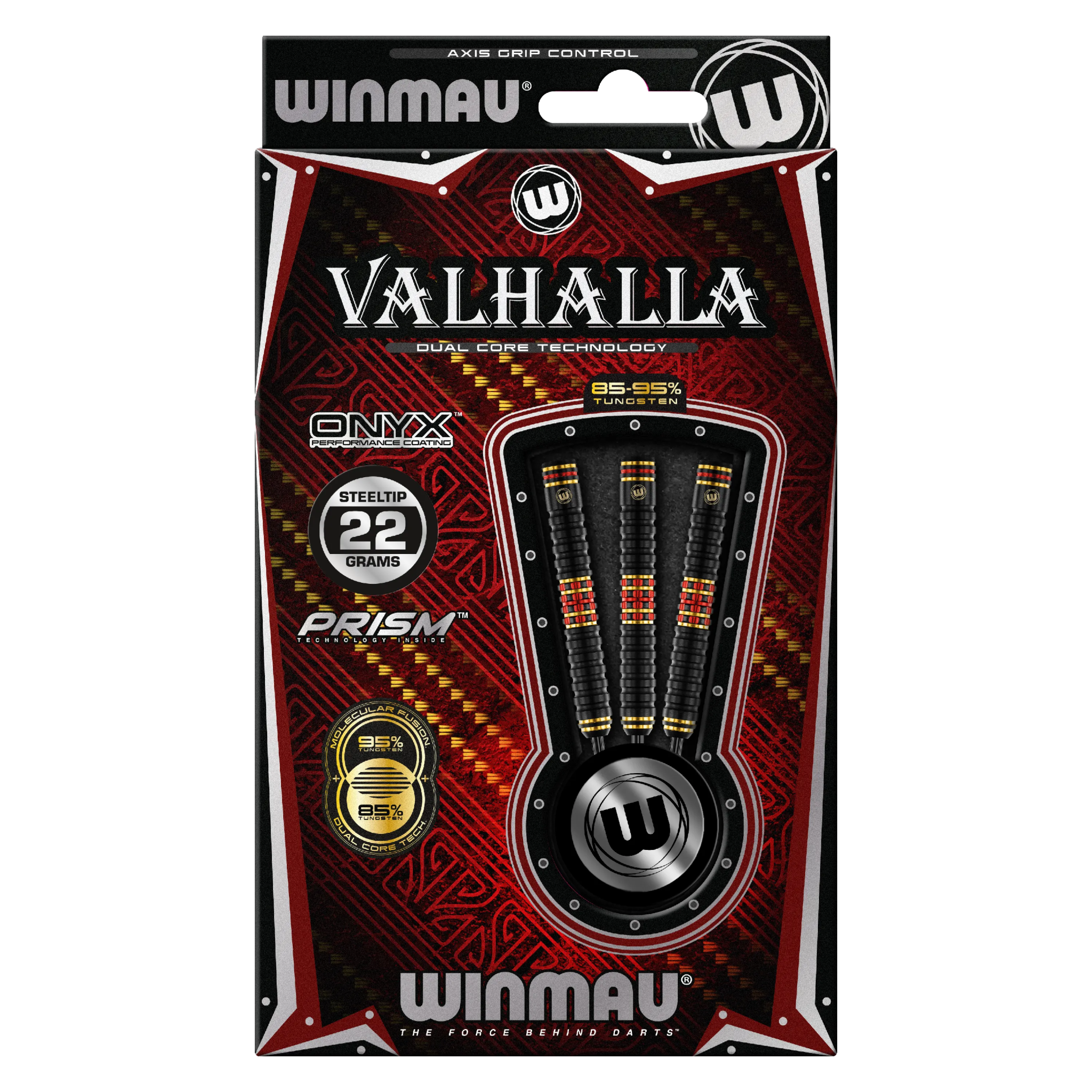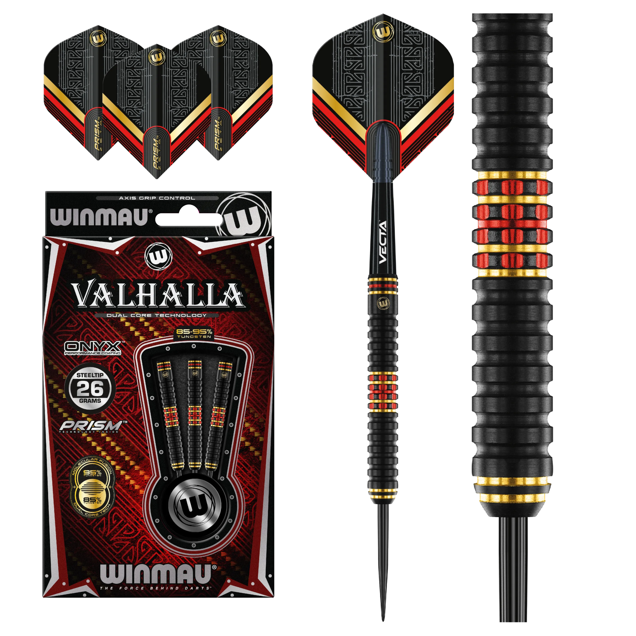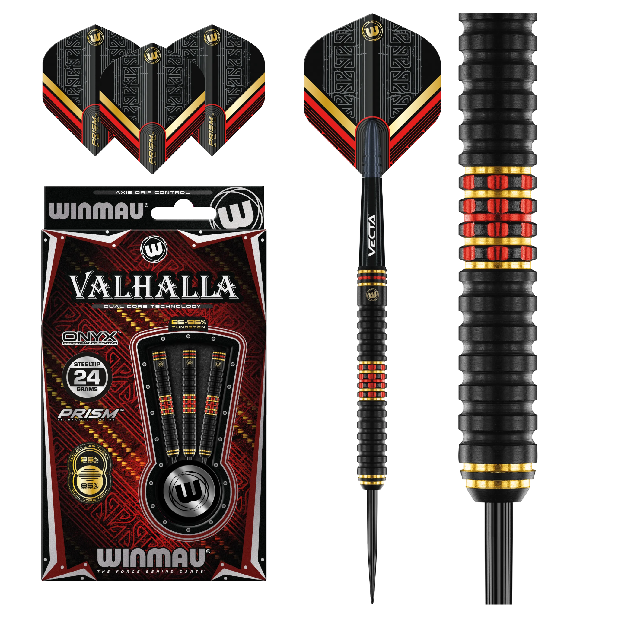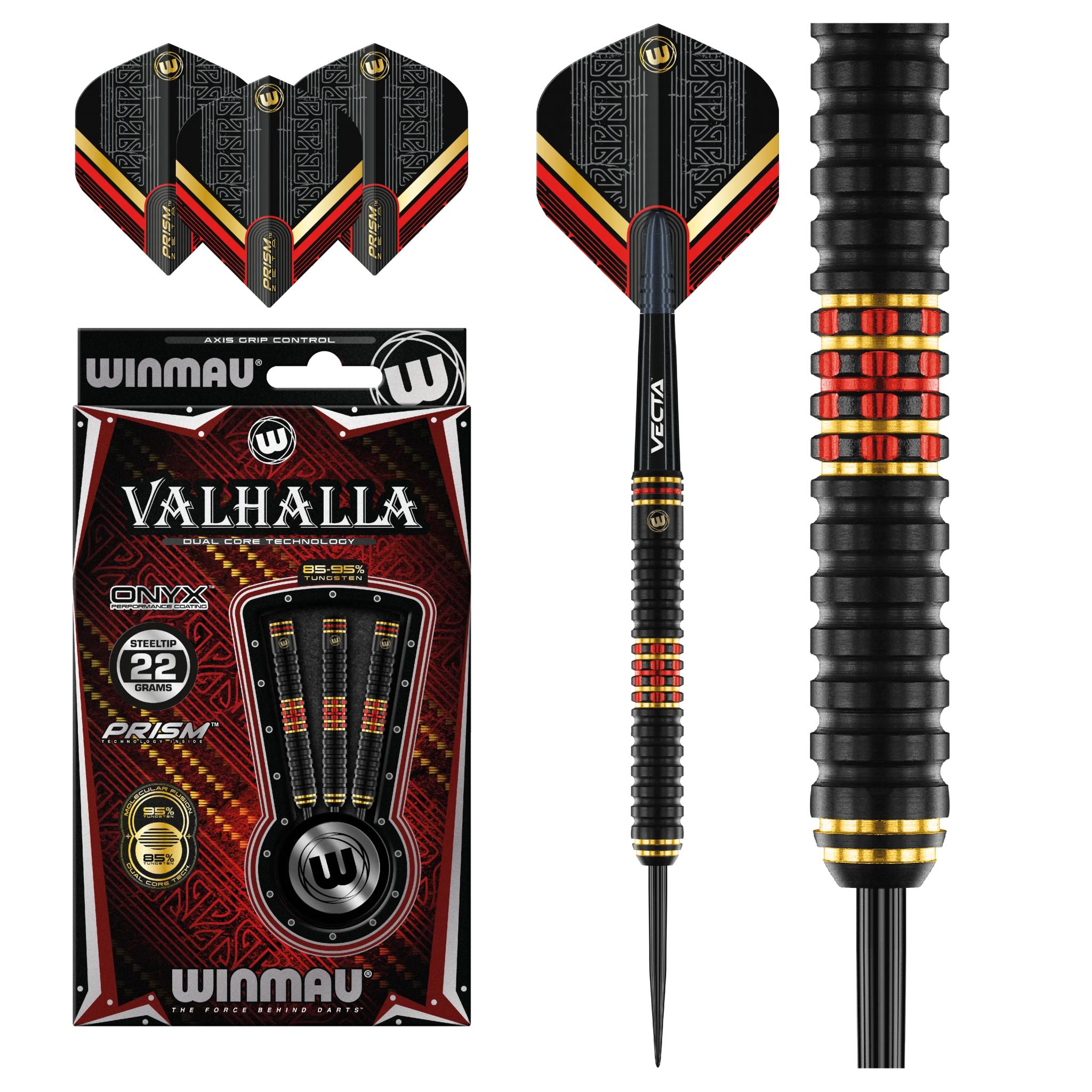 Valhalla epitomizes the evolution of darts innovation and heritage in the modern technological era and provides the darts headlines yet to be written. A stunning combination of Onyx PVD, red and gold details and the latest Torque Force enabled milled grip control. Darting excellence in every detail.