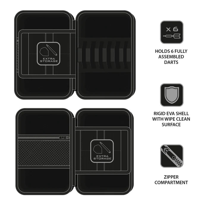 Im Inneren bietet das Case Platz für zwei vollständig montierte Dart-Sets sowie zusätzlichen Stauraum für Flights, Shafts, Spitzen und weiteres Dart-Zubehör. Durch die durchdachte Innenaufteilung bleiben alle Komponenten sicher an ihrem Platz – perfekt für unterwegs, Training oder Turniere.