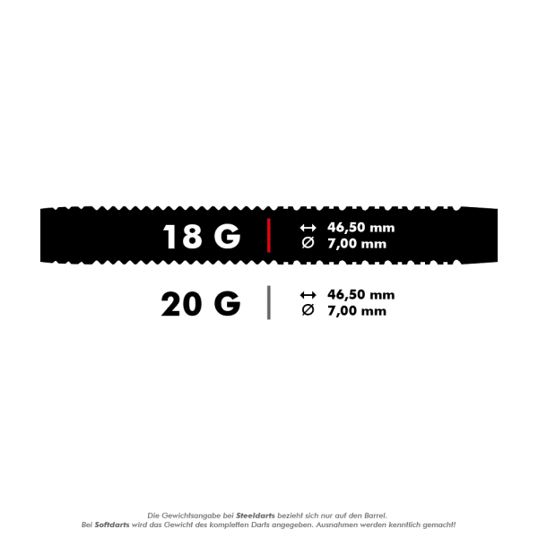 The Mission Nero Dart M1 has a straight cylindrical shape. In addition to the extremely durable black titanium nitride coating, the dart has various transverse grooves along its entire length. Additional transverse and longitudinal grooves in the rear area of the barrel give the dart the necessary grip. With engraved Mission logo in an unusual black design.