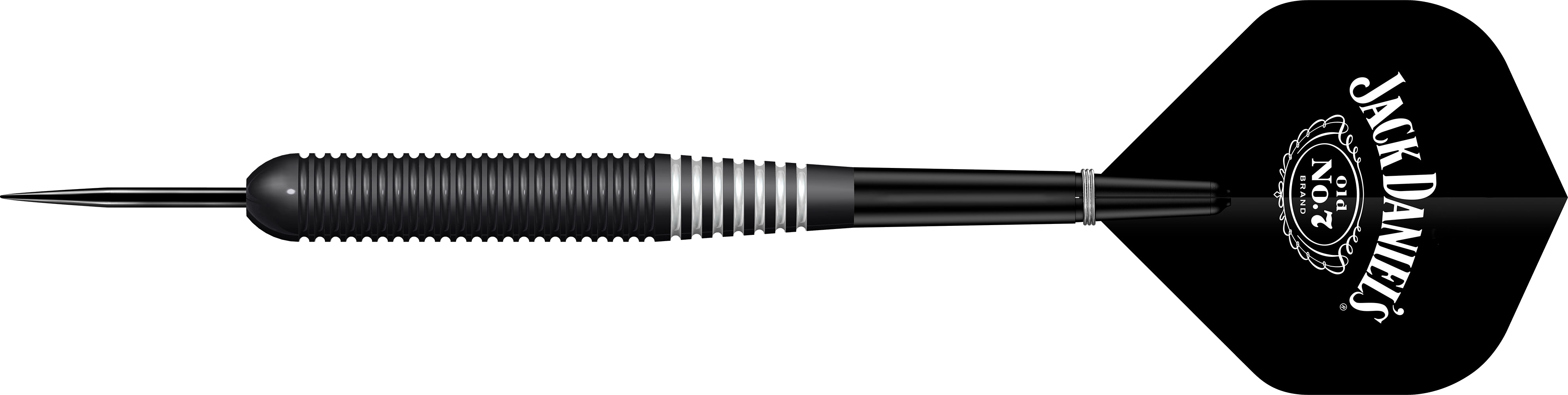 The Jack Daniels Brass Darts have a round initial shape that transitions into a straight barrel design with fine ring grooves. On the back of the barrel there is a very finely tapered rear section with 7 white painted grooves. The barrel is fully coated with black electroplating.