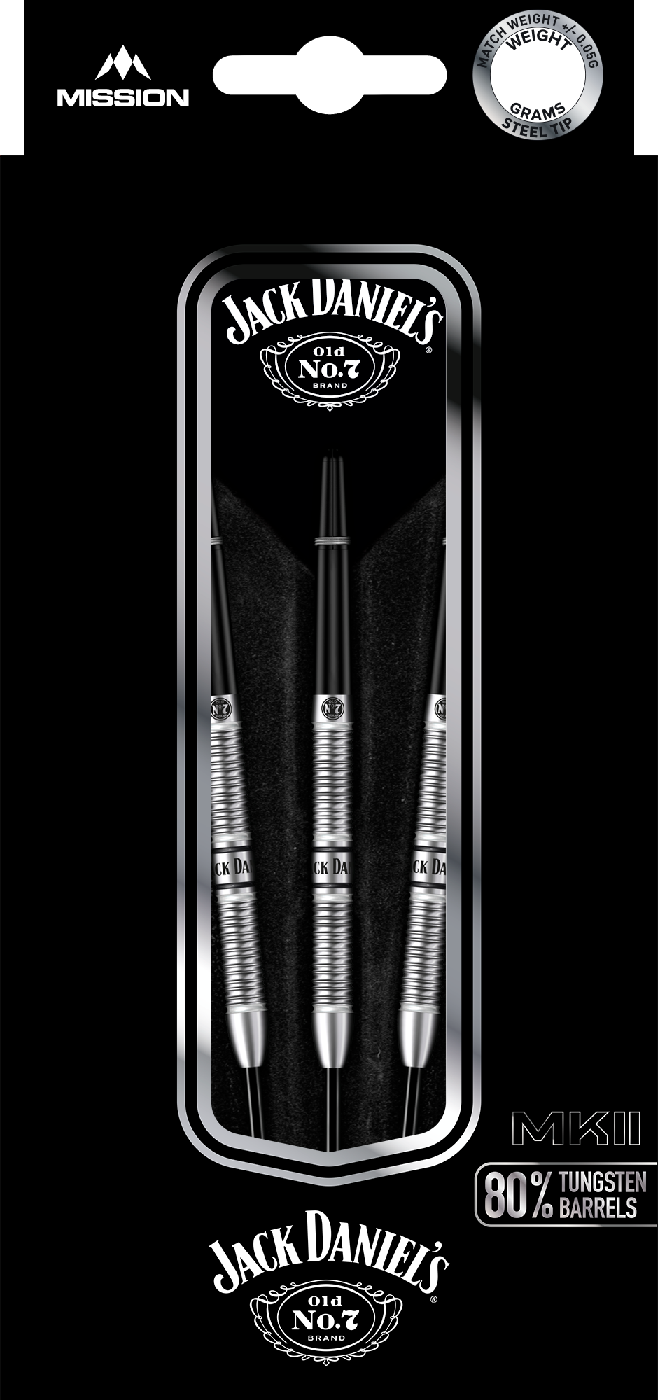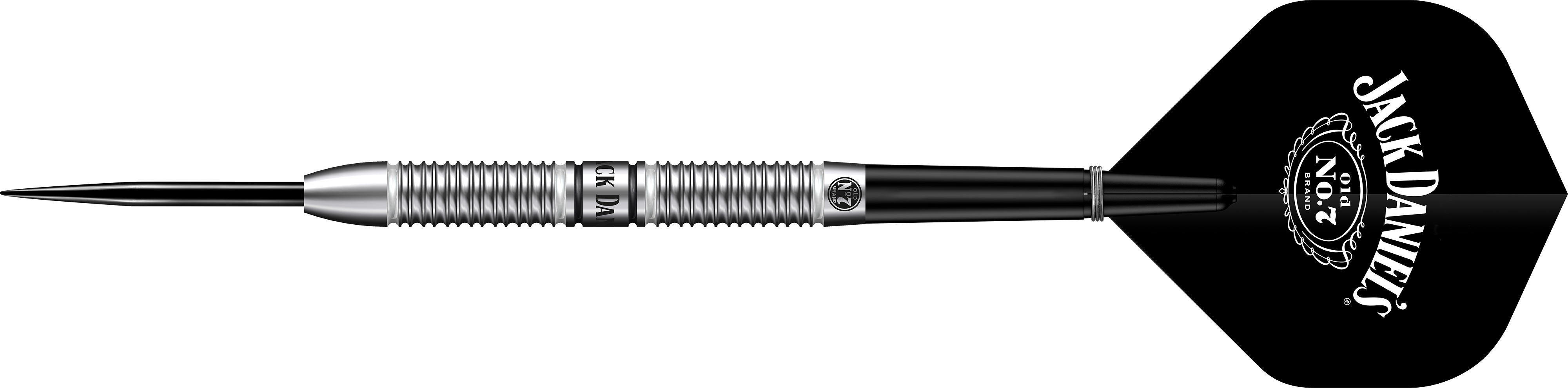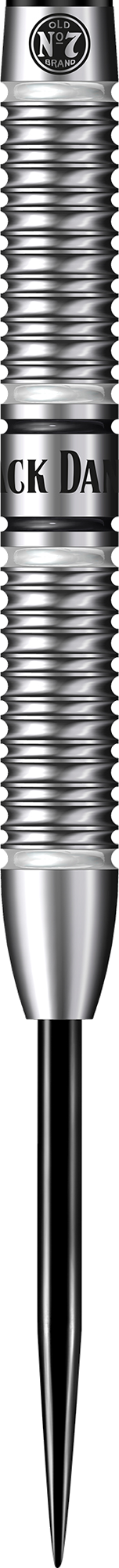 The Jack Daniels 80% Tungsten has a longer radius nose that flows into a straight barrel design. The front and rear parts contain a fine ring structure with black and white painted rings. The barrel has the Jack Daniels logo and the old No7 logo etched into it.