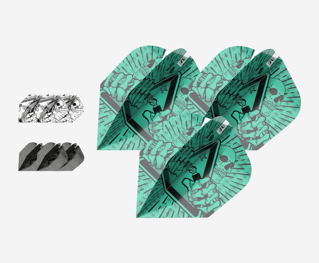 The flights feature a UV spot print to improve grip between the flight and shaft and are made from 100 micron material for added durability. The set of 3 consists of 1 set of flights in different colors.