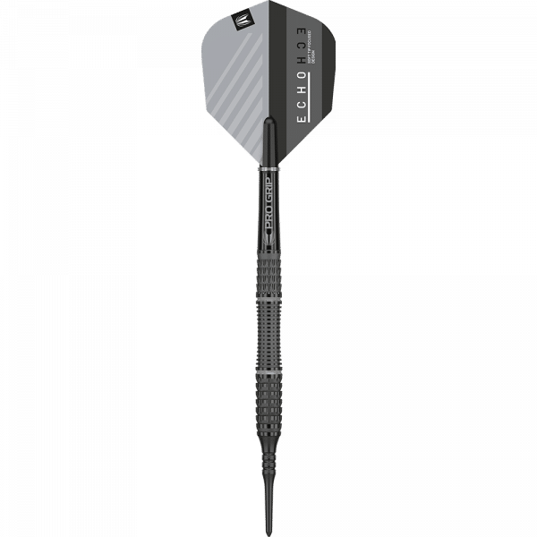 Echo, only available as a soft dart. Designed for soft tip players, the Echo range focuses on a range of barrel shapes, weights and grip that provide the perfect balance for soft tip throwers. Each barrel features a stunning black PVD coating with intricate radial grooves. The barrel is further enhanced by a gray color and the revolutionary hand-sandblasted grip incorporated into the grooves. Sandblasting uses extremely fine particles to create a distinctive matte texture that improves grip and throwing feel. The barrel designs all focus on optimal barrel balance for soft tip shooters as well as a seamless fit between the barrel and Target Pixel tip.