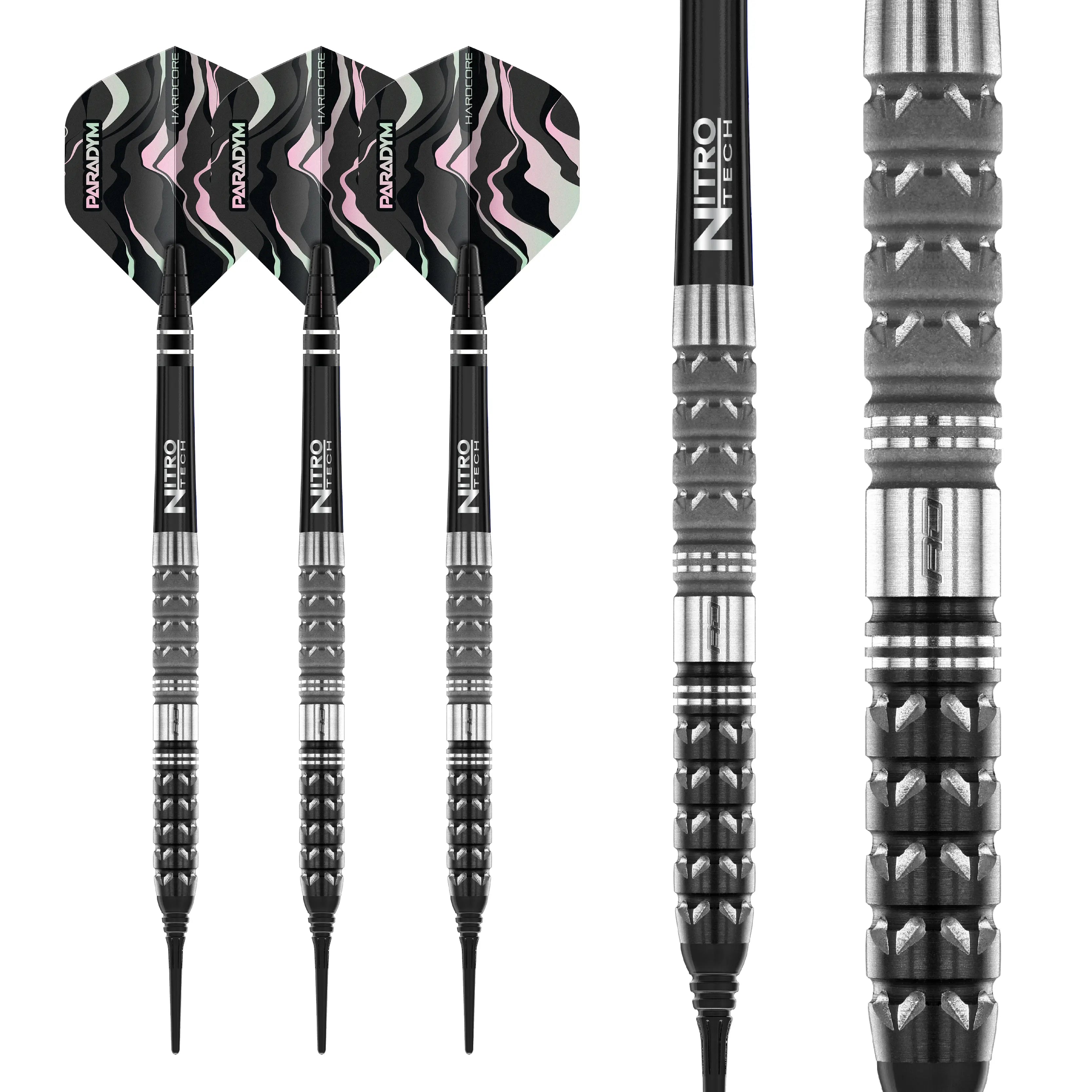Das Set ist ausgestattet mit schwarzen Nitrotech polycarbonate shafts (Short) und Hardcore extra thick standard Flights.