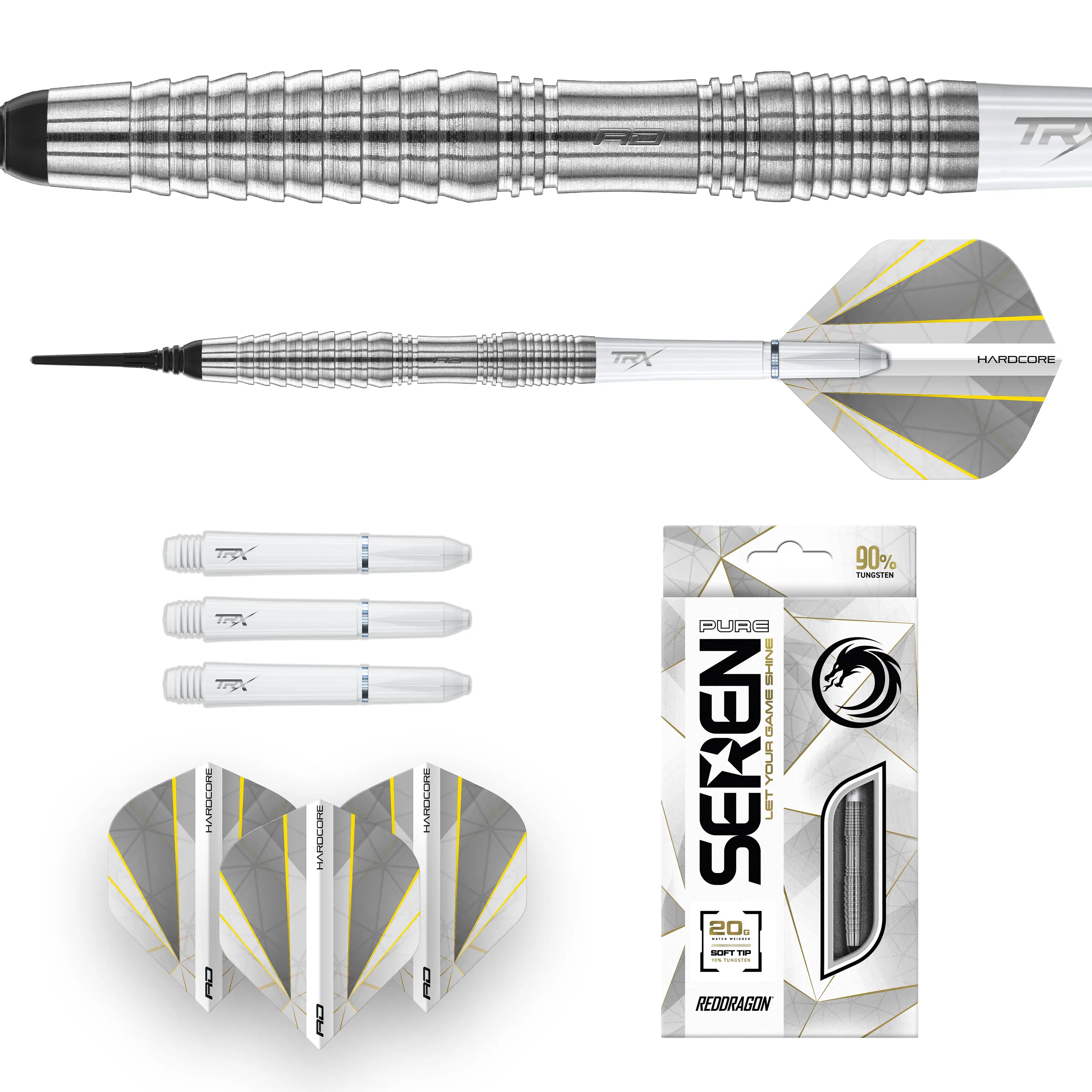 Das Set ist ausgestattet mit weißen TRX polymer shafts (Short) und Hardcore extra thick standard Flights.