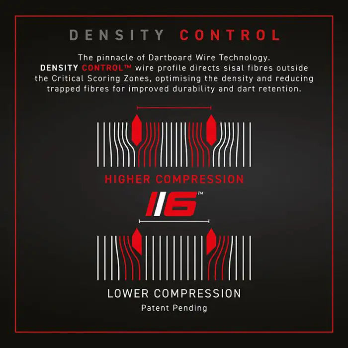 Ultracienki drut , nachylony pod kątem 60°, odchyla lotki w stronę punktu punktowania i zapewnia absolutnie minimalne odbicie. Całkowicie hartowany bullseye i zewnętrzny byk, oba z drutem Density Control™, są teraz o 25% cieńsze, a obszar nacięcia jest większy.