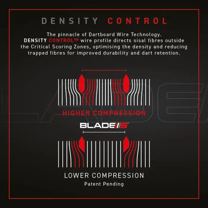 Ultracienki drut , nachylony pod kątem 60°, odchyla lotki w stronę punktu punktowania i zapewnia absolutnie minimalne odbicie. Całkowicie hartowany bullseye i zewnętrzny byk, oba z drutem Density Control™, są teraz o 25% cieńsze, a obszar nacięcia jest większy.