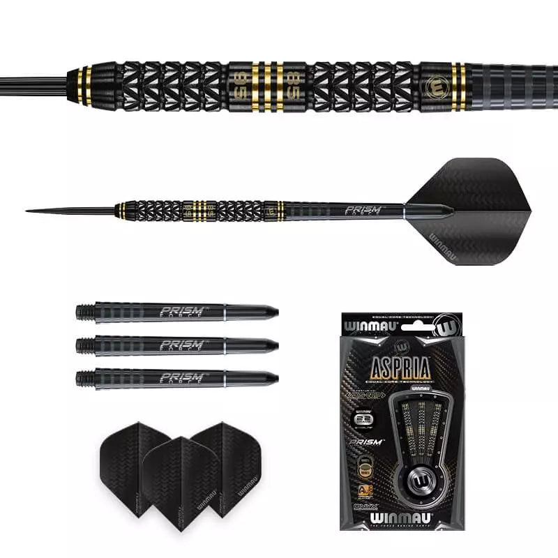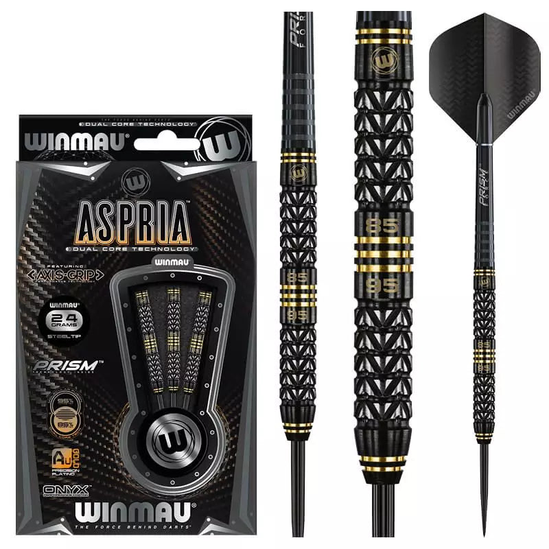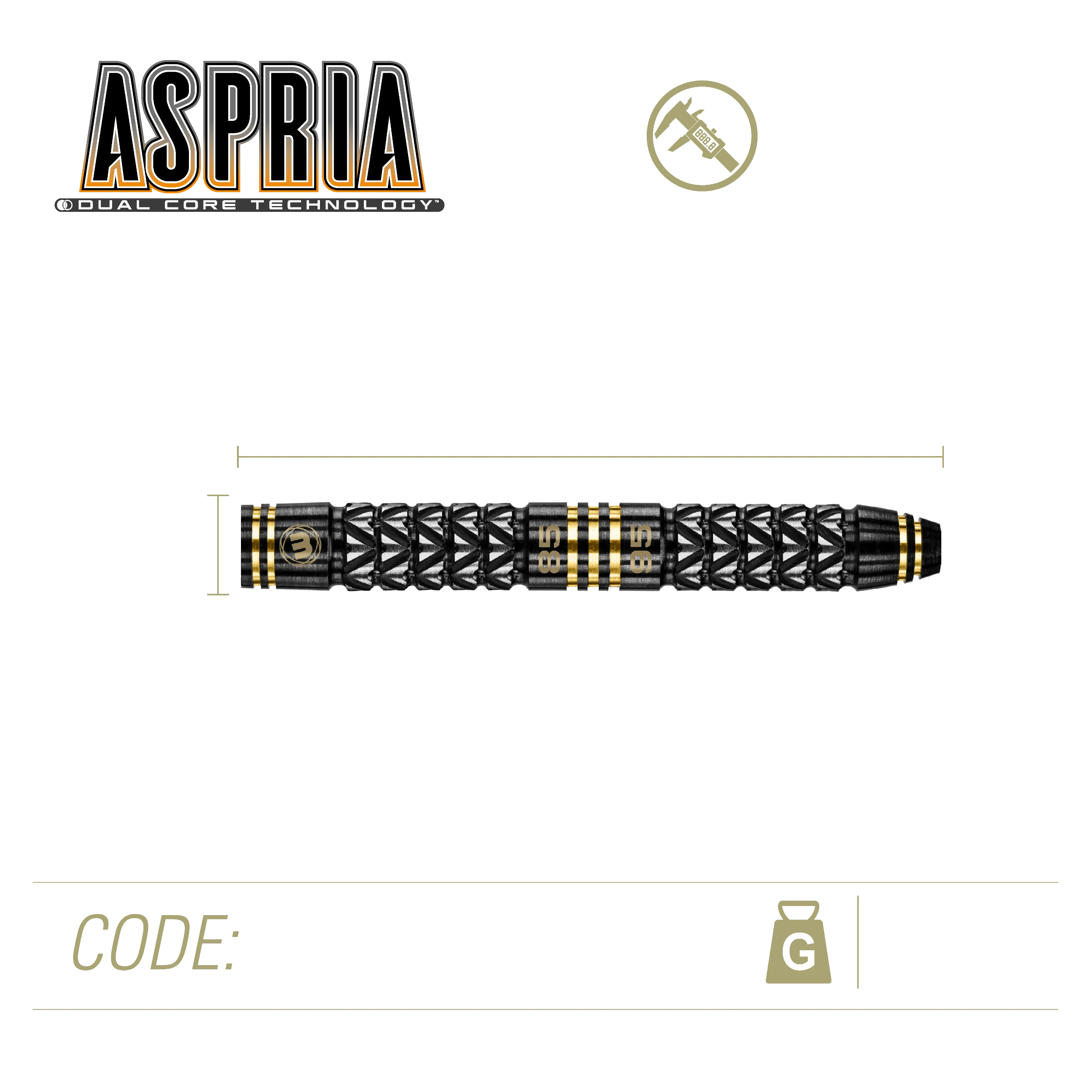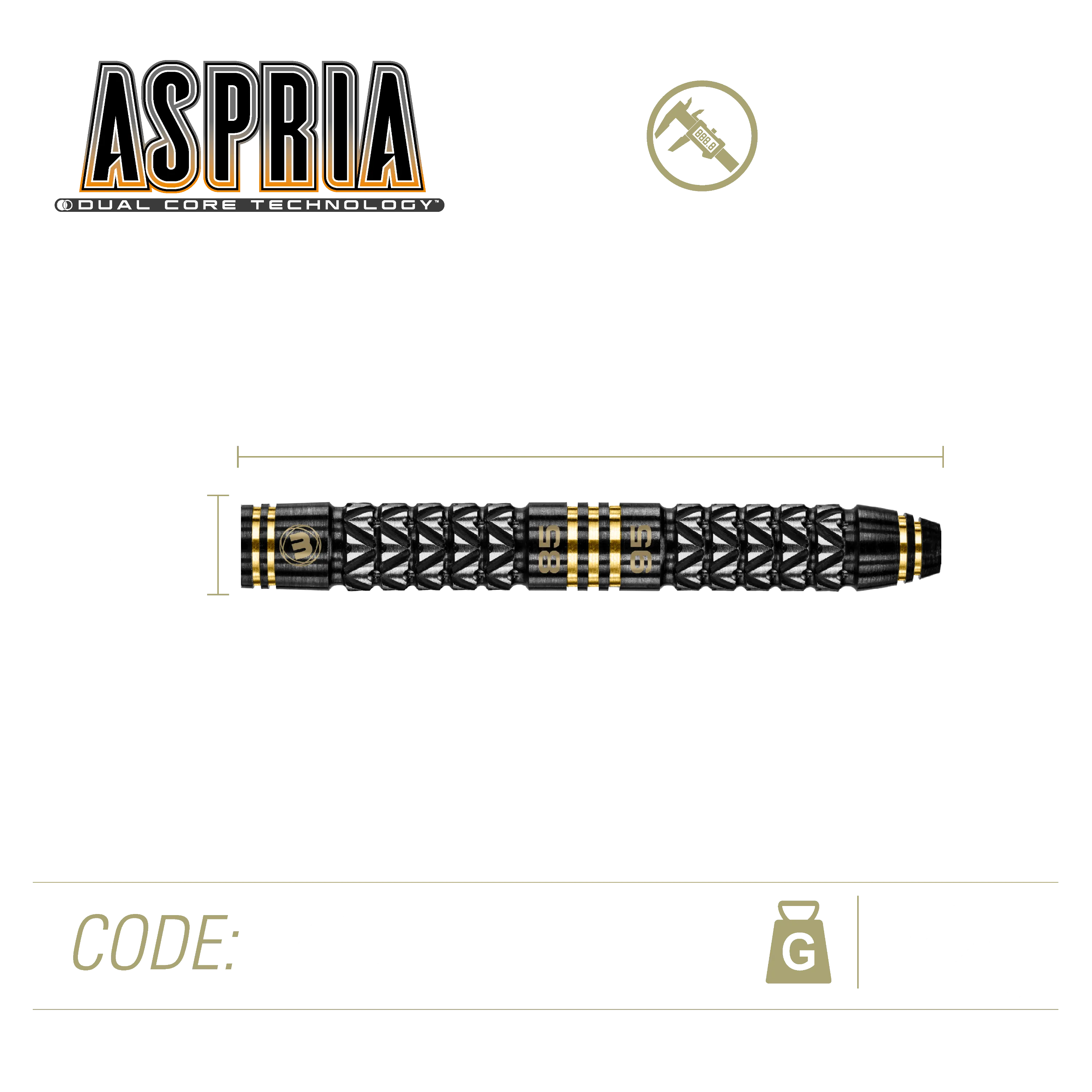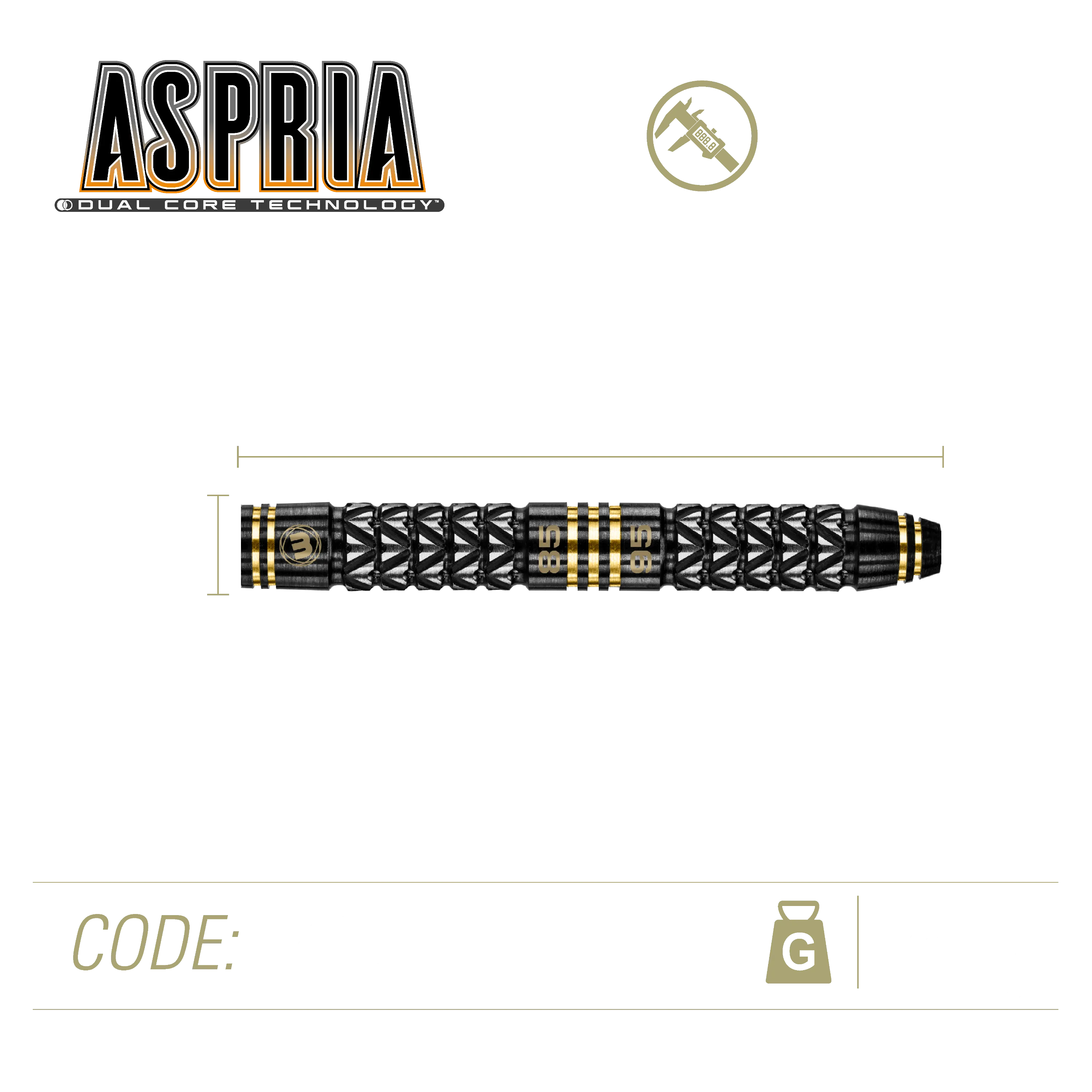 Asprias Dual Core, dwukierunkowy, precyzyjnie wycinany uchwyt Axis-Grip z najnowszą technologią obróbki CAD CAM. Wykonany z unikalnej dwurdzeniowej beczki Winmau z dodatkiem 95/85% wolframu. Pomimo równoległego kształtu lotka jest bardzo ciężka ze względu na różną gęstość materiału. Rzutki ładowane od przodu rozpoczynają nową erę projektowania rzutek, kunsztu i precyzji, wykończone prawdziwym złotem i powłoką onyksu.