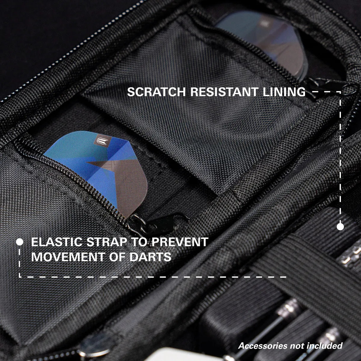 Das Dartcase bietet eine effiziente Organisation mit zwei Reißverschlusstaschen, die Platz für Ersatz-Dart-Zubehör wie Flights, Schäfte, Spitzen oder ein Swiss Point Tool bieten, so dass sie während intensiver Spiele leicht zugänglich sind.